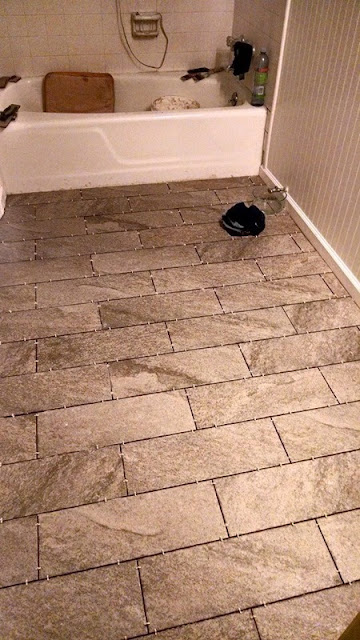 It would appear that I did not take photos of the demo work my husband and I did on the tile half wall... probably because I spent most of the time cussing myself (for messing it up in the first place) and the builders from 1966 (for how they built it). There was a layer of tile, an inch of mortar, and wire mesh behind the mortar (of course). I was expecting all of this, but that doesn't mean I cussed any less. The photo below shows the repaired wall in the background (I had pieced the sheetrock into the hole that was left and patched the seams and screws). It also shows the tile immediately after it was laid. We also had to do a layer of self-leveling concrete on top of the foundation because (as you can see in the photo above) not all of the mortar would come off of the foundation. This is an easy solution to get back to having a flat surface on which to install the new tile. Apparently it was not exciting enough to warrant a picture. The second photo below shows the floor after grouting the tile (we used charcoal gray grout again).